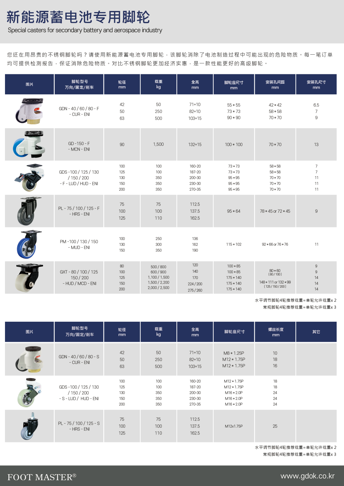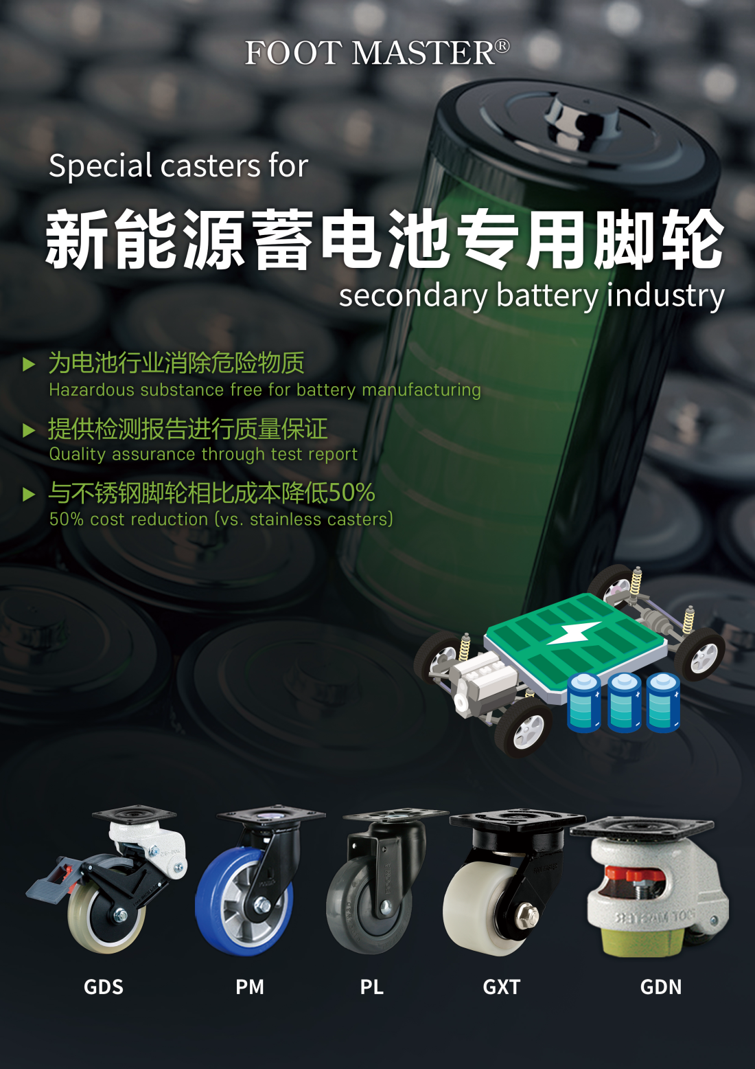 作为严格遵守电池产业独特而严格规定的脚轮,去除了在电池产业生产线中有着致命物质的脚轮
